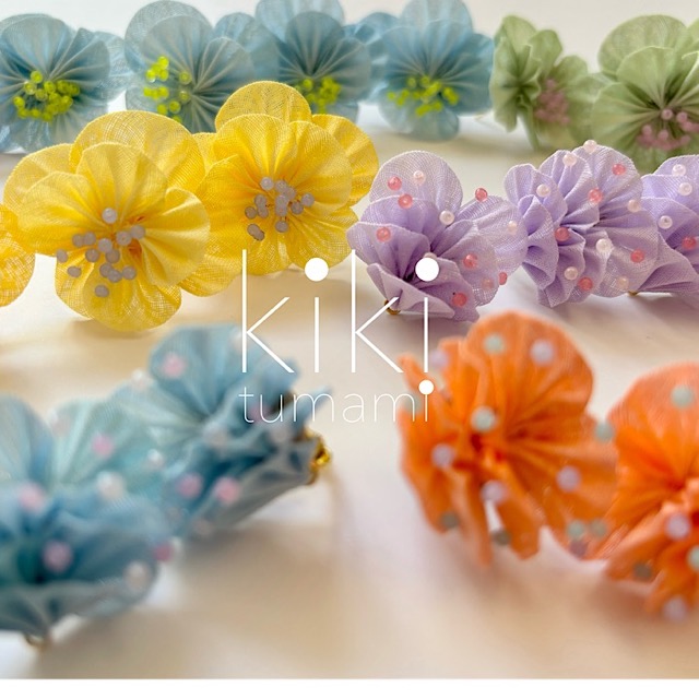 - 生地1枚1枚にグラデーション染めを施し、「ひだよせつまみ」というつまみ細工の技法を使ってオリジナルのアクセサリーを制作しています。和の繊細さとカラフルポップが組み合わさった現代風伝統工芸をぜひお手に取ってご覧下さい。