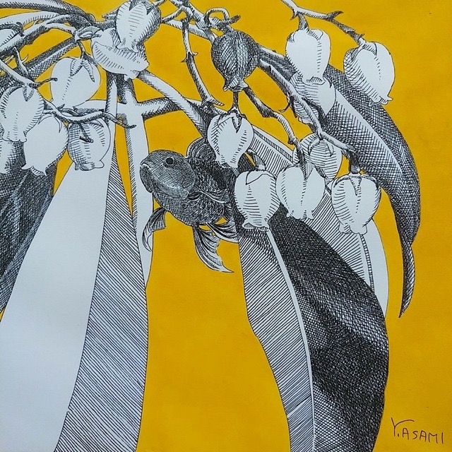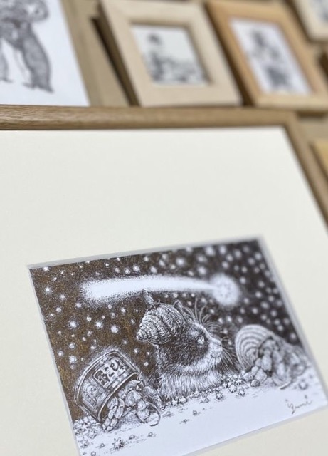 - 手乗りサイズの海の生き物を木で表現した温かな置物は、会場でお客様と相談しながらブローチや磁石にも。金魚の繊細なペン画、動物を題材にしたペン画の原画やミニ絵、ポストカードもご用意。テーマは『宇宙と海』。ふたりの世界をお楽しみください。