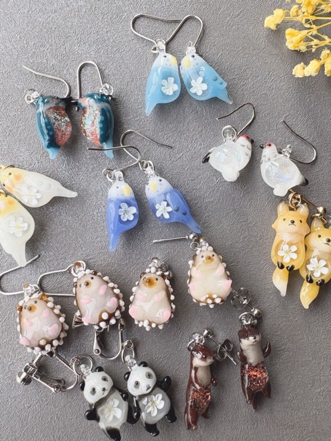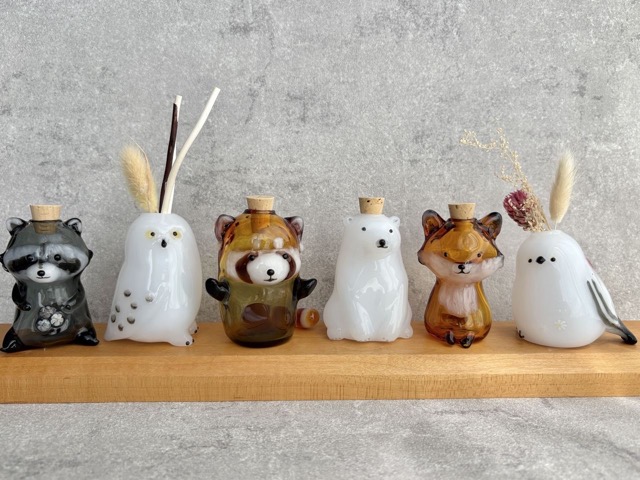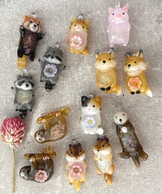 - クマやアライグマ・キツネ・ハリネズミなど様々な動物をモチーフにしてガラスのペンダント・一輪挿し・ピアスなどを制作しています。耐熱の軽くて丈夫なガラスを高温の酸素バーナーで溶かして1つ1つ制作しています。動物の温かさ・可愛さをガラスで表現できるように細かい所までこだわって制作しています。こんな動物作って欲しい等もお話し出来ると嬉しいです。是非遊びにお越しください。