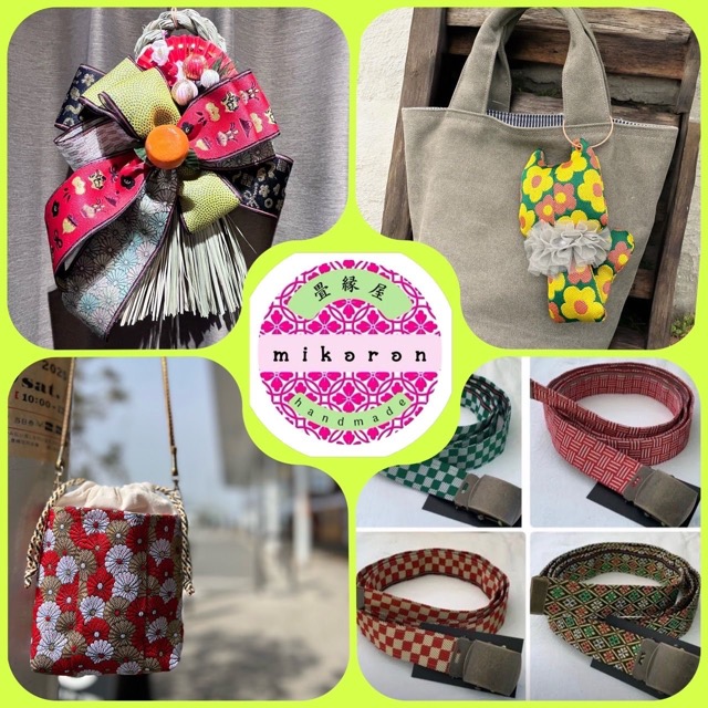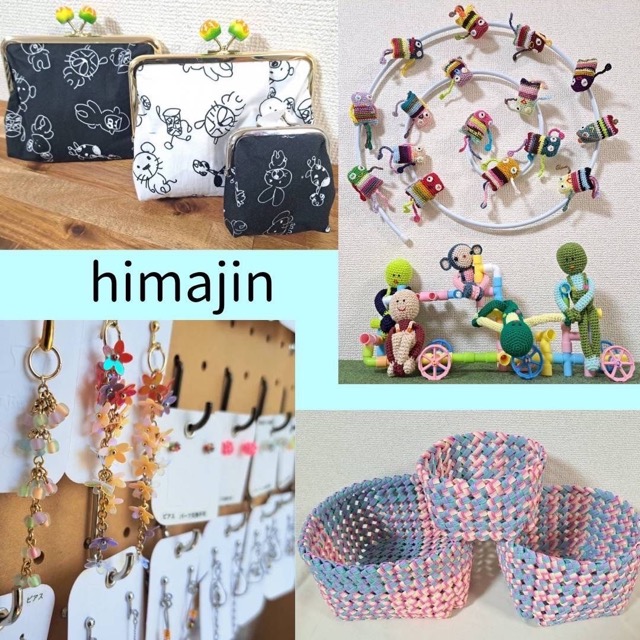 - 【mikoron】畳縁の手触りや質感を楽しめる普段使いから和装にもピッタリな畳縁を使用した小物やアクセサリーを製作しております。【himajin】クスッと笑えるあみぐるみや布小物、男性が作るビーズアクセサリー、クラフトバンド雑貨を家族で制作しています。【デニムリメイク8piro】古着のジーンズやデニムジャケットをリメイクした1点もの!バッグや小物を制作しています。