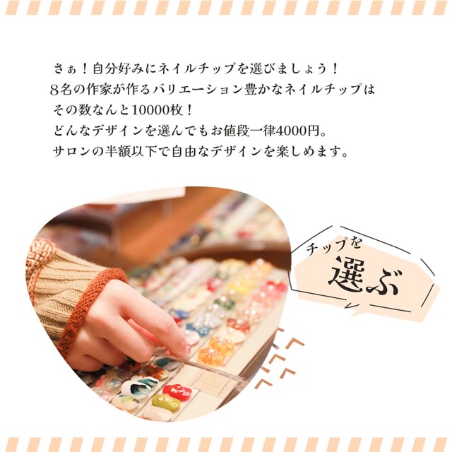 - その場でサイズを測り自分で自由に選べるネイルチップを販売します。8名の作家が手作りするネイルチップはシンプル、カラフル、パーツゴテゴテ、マグネット...種類様々!推しをイメージしたり、成人式の振袖と合わせたり、自分の好きな色を組み合わせたり...。あなただけの自由な発想で10枚選んでみませんか♪