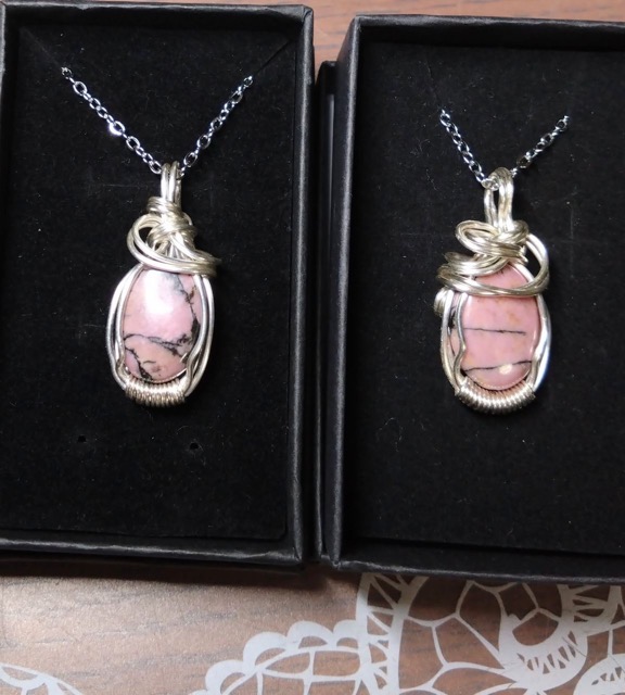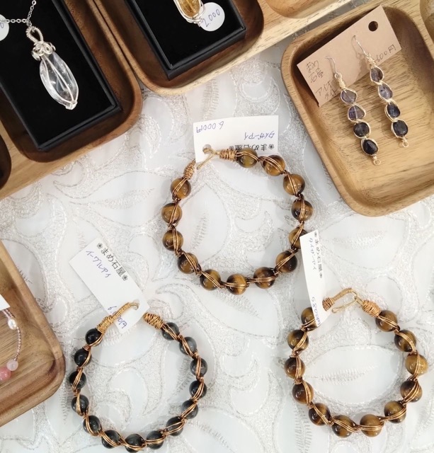 - 天然石をアーティスティックワイヤーでラッピングしたネックレスや耳飾り、ブレスレット、形状記憶ワイヤーの着脱簡単ブレスレットを作っています。 いろんな石があるのでお手にとってご覧ください。