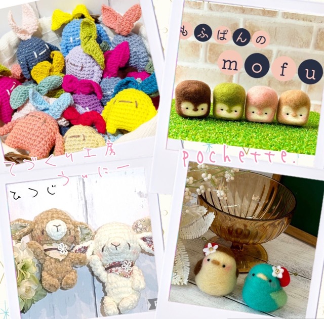- てづくり工房うぃにーでは、可愛い動物達や、ちょっぴり変なオリジナルキャラクターのあみぐるみ、手編み雑貨、新作あみぐるみオブジェ「ジオLANA」を販売いたします。pochette.では、羊毛フェルトで作成した、スイーツモチーフのオリジナルキャラクターマスコット、羊毛フェルト雑貨の販売をいたします。日々の生活にふとした癒しをお届けできたら...。そんな気持ちを込めて制作しています。よろしくお願いします。