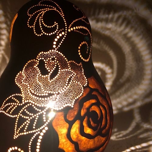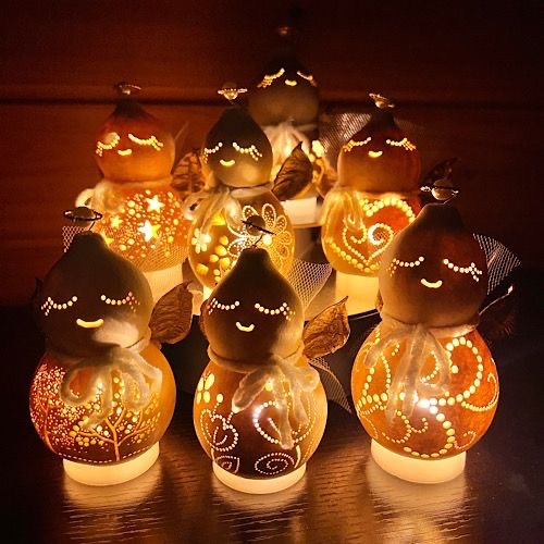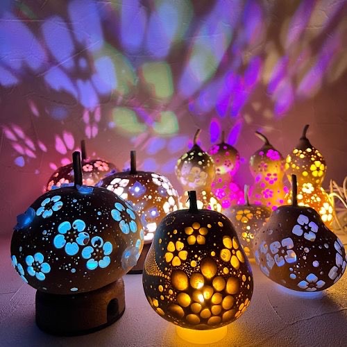 - 自家栽培した大小様々なひょうたんを使ったランプやアクセサリーを製作しています。 ひとつとして同じ形の無い作品達との出会いをお楽しみください。 季節もののスノーマンや招き猫、手作りキット、ミニランプキーホルダーなどお手頃な物もたくさんお持ちします!