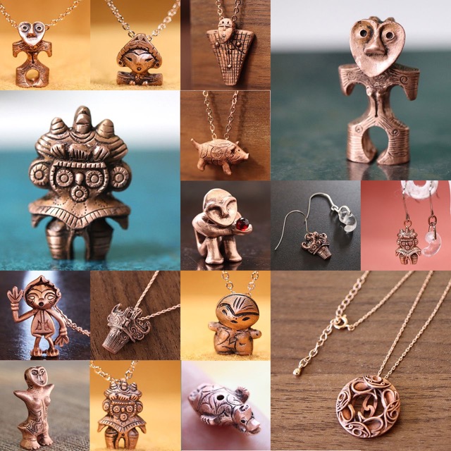 - 数千年前に作られた縄文土器や土偶に魅了されて、ちいさな縄文アクセサリーを作りました。さらに古墳時代の埴輪や副葬品もラインナップに加わり、出展ブースは考古学のミニ博物館のような空間になります。手作りのワックスモデリングによる表情豊かで精緻な作りのアクセサリー。生き生きとした躍動感あふれる造形をぜひご覧ください。土器・土偶・埴輪の質感を出すために、めずらしい純銅の鋳造にチャレンジしています。