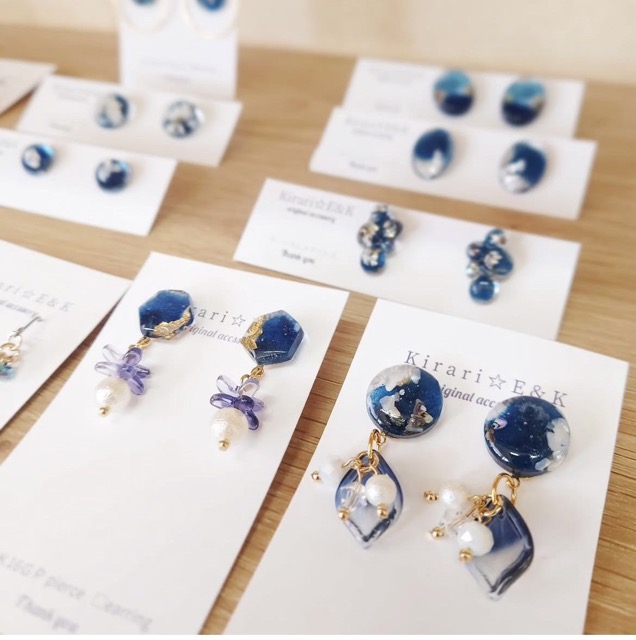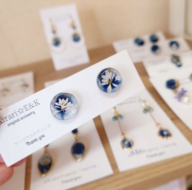 - あなたらしさがもっと輝く大人綺麗なアクセサリーを制作しています。藍染や押し花を閉じ込めた一点物のレジンアクセサリーを手にとって、お好きな子を見つけてみてください。