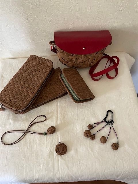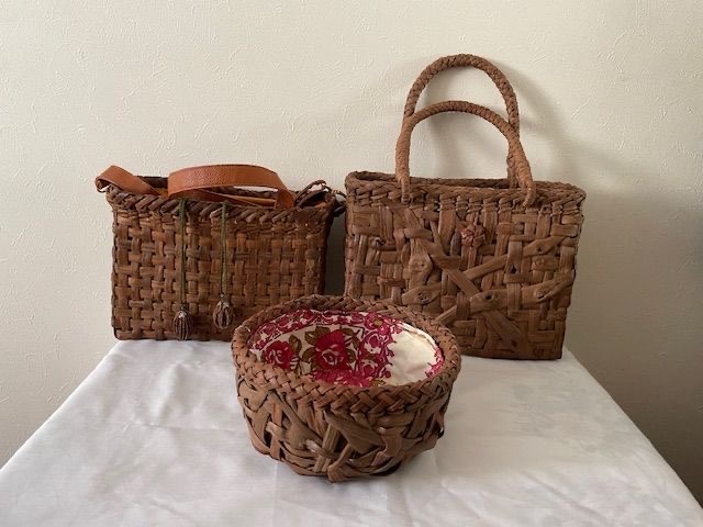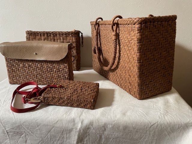 山葡萄の蔓の皮で編んだ、手提げバッグ、ショルダーバッグ、財布等、全て一点ものです。写真には掲載してありませんが、A4サイズの書類等も入る、大型の手提げバッグを製作中です。ご来場の折は、是非お立ち寄りください。