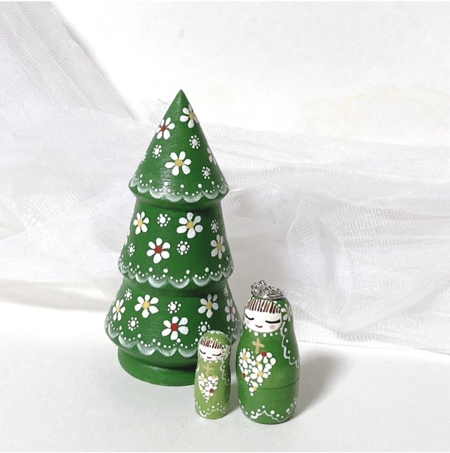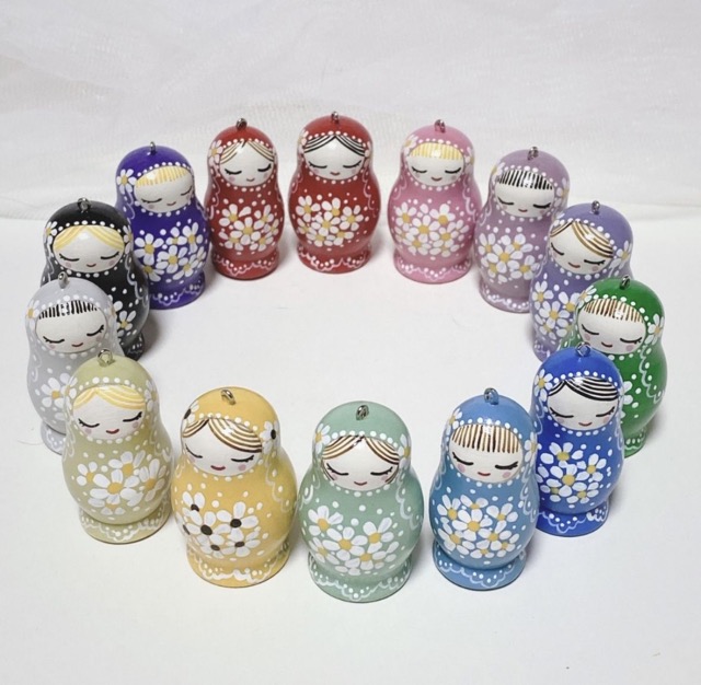 - ロシアから輸入した白木のマトリョーシカにオリジナルの絵付けをしています。マトリョーシカは次々と中から出てくる「入れ子」や「小物入れ」「ストラップ」「オーナメント」など。他にもマトリョーシカとお花を組み合わせたハガキなども作っています。