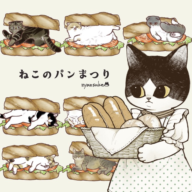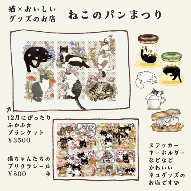 - ハチワレ猫のハチワレちゃんはお友達の猫ちゃんをパンに挟んだりラテにしたり、でもみんにゃ楽しそう!そんな猫ちゃんたちが可愛いグッズになったよ、ぜひ見に来てにゃ