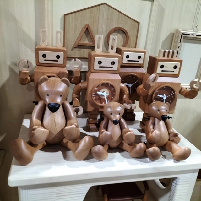 木製のテディベアやロボット、車など展示します 是非、遊びにいらしてくださいませ。