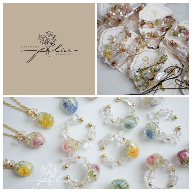 - felice:本物のお花を使用したレジンアクセサリー。 ひとつひとつ丁寧に閉じ込めた小さなお花。 あなただけの特別な一粒を rapportwith: 暮らしの中に彩りと癒しを感じるようなインテリアフラワーをお作りしています。 lumiele: 毎日使うバッグだからこそ オリジナルで特別なのを大人になっても可愛いがスキ!使う度心弾む、上品で可愛いbagを目指しています。
