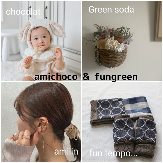 - amiiin : “ノンストレス”イヤカフ インド刺繍アクセサリー Chocolat : 天使スタイ & デビルスタイ fun tempo... : ベレー帽、ポーチ、ハンドウォーマーなどの布小物 Green soda : クリスマス雑貨やお正月雑貨の販売