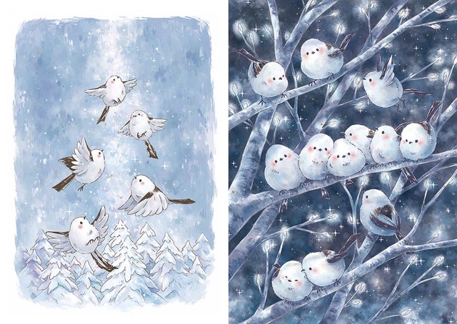 - シマエナガ、ペンギン、猫などを中心にほっこりかわいいイラストを描いています。ポストカードや原画、キーホルダーなどの雑貨を販売します。
