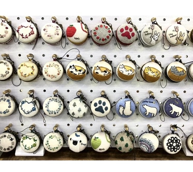 手刺繍入りのマカロンポーチやリアルな動物の刺繍フレームなどなど。全て手作業で仕上げた刺繍雑貨たくさんあります