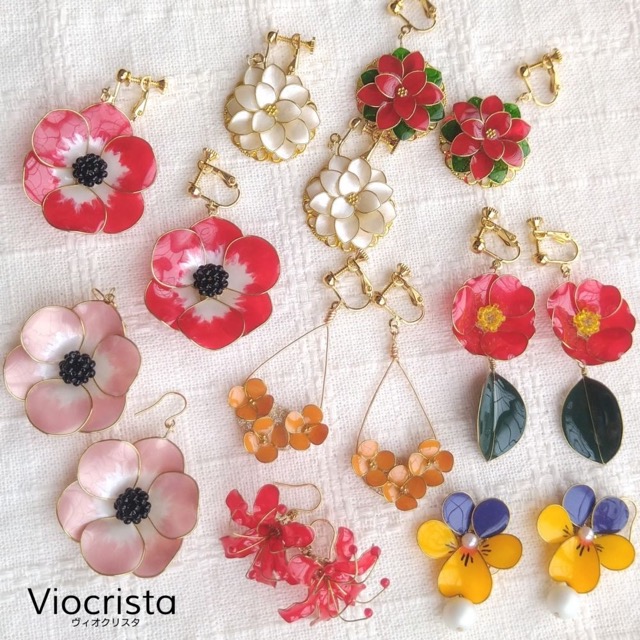 - Viocrista(ヴィオクリスタ)と申します。 花びら一枚一枚をワイヤーで形作り、液体樹脂で膜を張ってマニキュアで着色した、ディップフラワーのアクセサリーを作っています。 四季折々のお花をそのまま結晶化したような、素朴で繊細なアクセサリーをお手にとってご覧くださいませ。