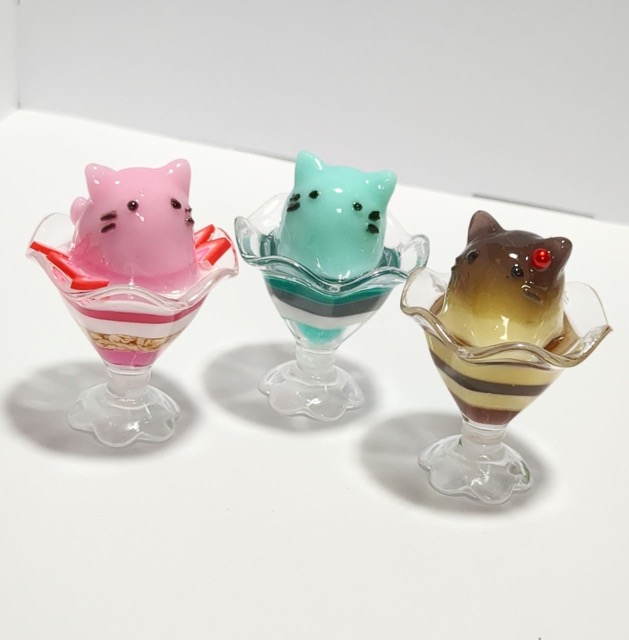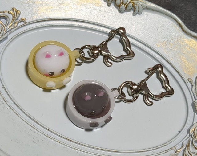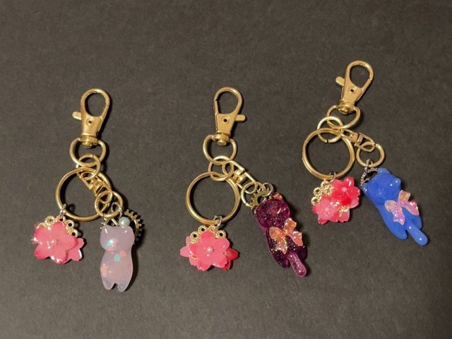 レジンで作った猫をモチーフにしたキーホルダーなどを