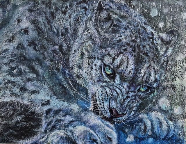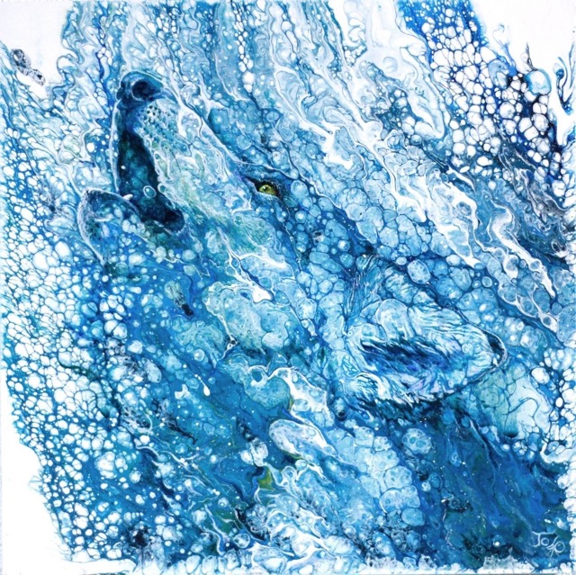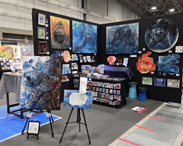 - キャンバスに絵の具を流し込んで作る模様の中に見付けた「いきもの」を描いたり、トイレットペーパーをはじめ様々な素材をオリジナルのマチエールに、その上に力強くそして色鮮やかに「いきもの」を描く動物画です。 原画とポストカードやステッカーなどのグッズを販売します。