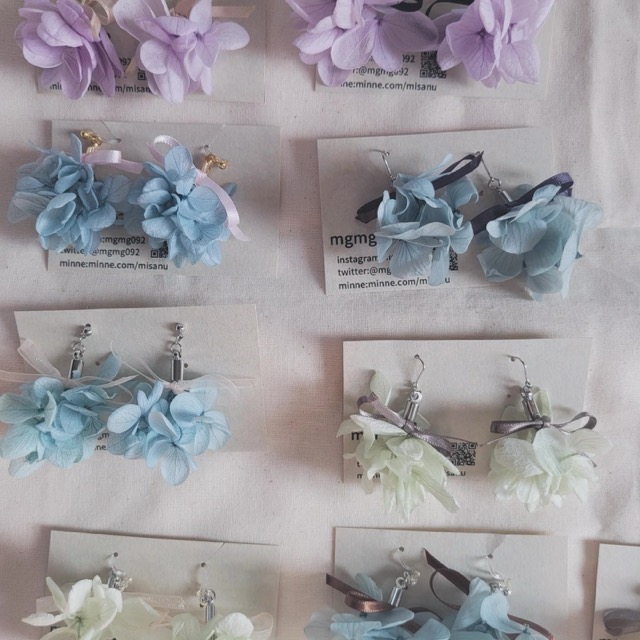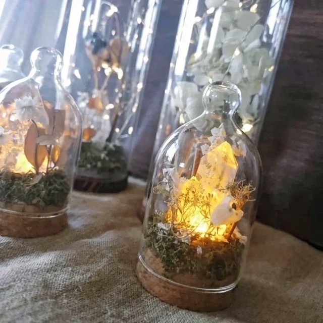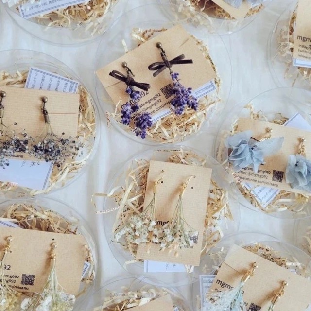 - ドライフラワーやドライリーフを使用したブーケイヤリングやアクセサリー小物です。 光る植物のオブジェなどインテリア雑貨もございます。