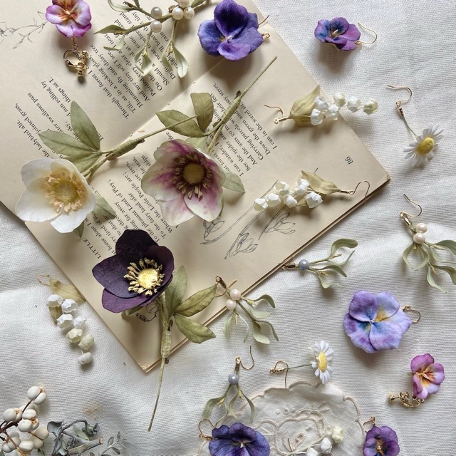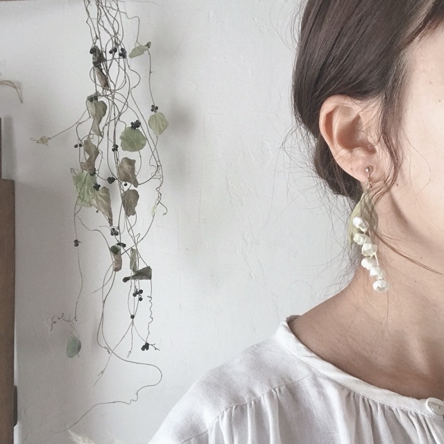 - 白い布を描くように染めた布花のアクセサリー 自然に生まれる色形のように 季節ごとに変わりつづける 一枚ずつひとつずつが異なる一輪を アクセサリーに仕立てています 野原で摘んだ一輪をそのまま耳にさすように 繊細で やさしく さりげなく カジュアルに ナチュラルに 気軽に身につけられる布花をつくっています