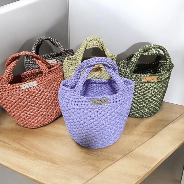 - かぎ針で編むバックや小物 昔懐かしい、大人かわいいをテーマにかぎ針で麻紐やスズランテープ、毛糸などでバックや小物を制作しています。 オリジナルの引き揃えバック、スズランテープバックをぜひお手に取ってご覧ください。