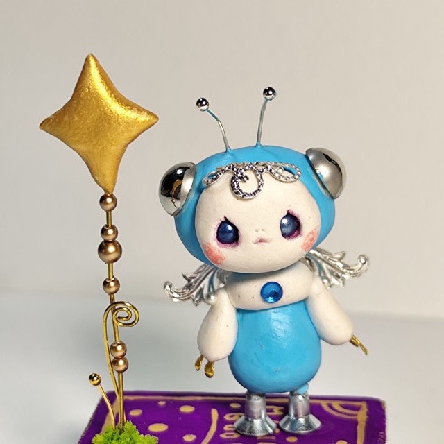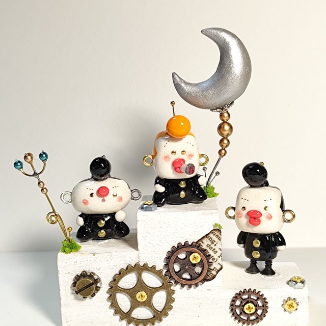- 石粉粘土と色んな素材を使ったロボットです。動物、果物、野菜、架空のイキモノなど色んなものをロボットにしています。手にとってクスッと笑ってもらえると嬉しいです。