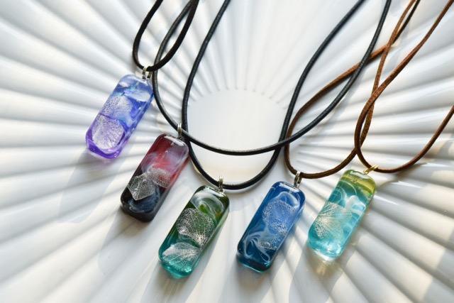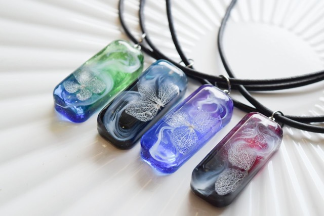 - ドライフラワーのレジンアクセサリーはたくさんありますが、 紫陽花だけを使って、最大限の良さを使えることに徹しております。レジンに封入するときは、屈折により拡大して見える葉脈の透け感を見せるために、ちぎれていない花びらのみ厳選して使っているところがこだわりです。葉脈を最大限に見せるために《ガラスみたい》といわれる透明感と標本のようなデザインを是非直接店頭にて見て頂きたいです。