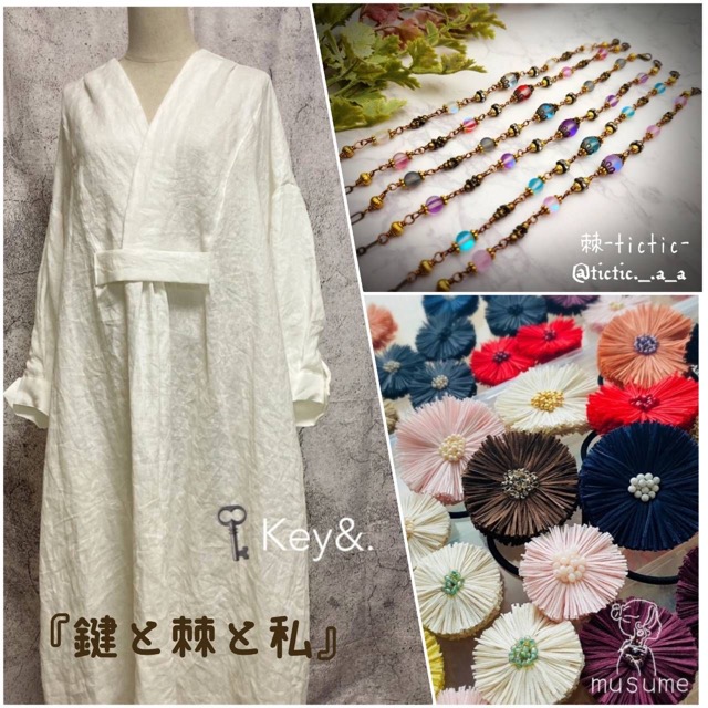 - Key&.:シンプルなものにさりげなくかわいさをプラス☆機能性とコーディネートのしやすさにこだわりを持つリネン使いを中心としたお洋服 棘-tictic-:オトメゴコロをちくちくあなたのこころにそっと寄り添うアンティーク風のアクセサリー musume:お花をモチーフとした刺繍とコットンギマの心躍るようなアクセサリー 流行やスタイル・年齢にとらわれることのない三者三様の創造作品をぜひ見にきてください