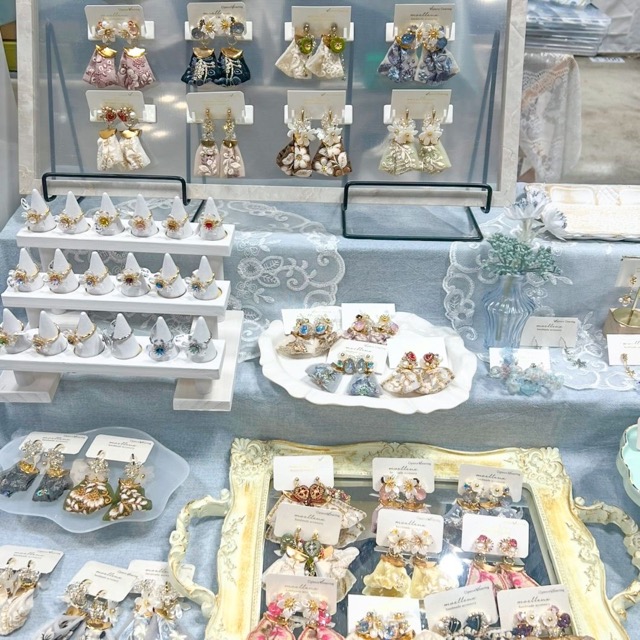 - フラワーモチーフをメインに使用しインド刺繍リボンや、キラキラストーンなどを使用してピアスのキャッチ変更やイヤリングの金具変更で2つのデザインで楽しめるイヤーアクセサリーをメインにお作りしております。 ブースに立ち寄ってくれた方、そして購入してくださった皆様がココロがふわふわあったかな気持ちになれるようなアクセサリーと売り場・接客を!をモットーにイベントや制作活動をさせていただいております。
