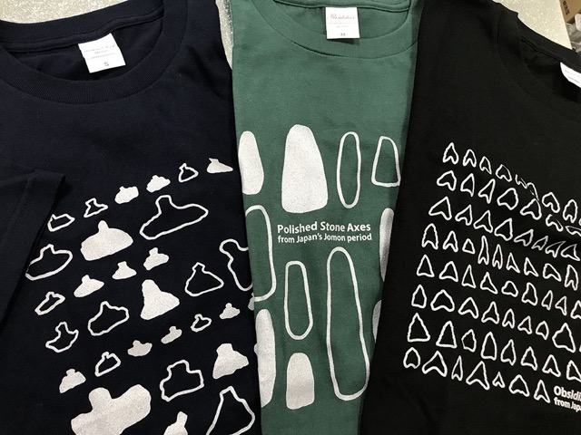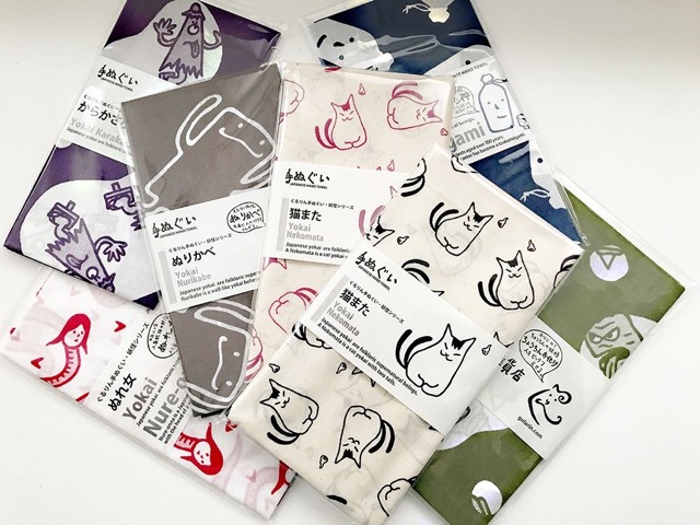 縄文や妖怪柄の手捺染手ぬぐいやTシャツなど。