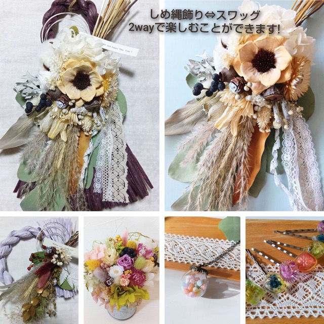 - スイーツやフルーツモチーフのアクセサリー、花雑貨の販売を行います。 11月から年末にかけては、しめ飾りの後にスワッグだけを簡単に取り外して 長い期間インテリアとして楽しむことのできる「2wayしめ飾り」をメインに販売します。 長く楽しんでいただけるデザインと材料選びを心がけています。