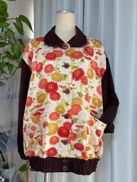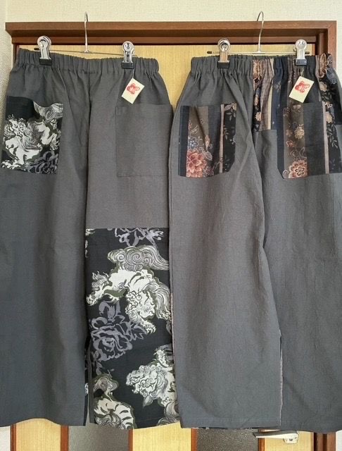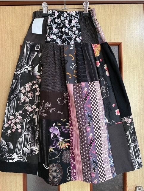 和柄木綿で洋服を作っています。パッチワークスカート、パッチワークパンツ、アロハシャツ。着物をリメイクしたブルゾンジャケットも作りました。手にとってご覧ください。