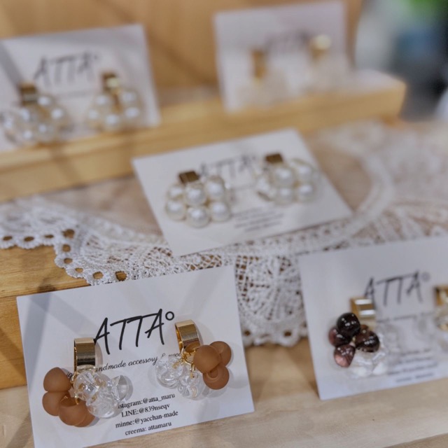 - はじめましてATTA°(あったまる)と申します。 ご来店くださった方々に、「あったあった!こんなの欲しかった♪」と心"温まる"瞬間を共有できればとの想いから名付けた店名となっています。 私が思う『可愛い』を共感していただけたら嬉しいです。 アレルギー対応の金具を使用し、安心してお使いいただけるようになっております。 各種金具の変更もその場で行えます。 お気軽にお声かけください☆