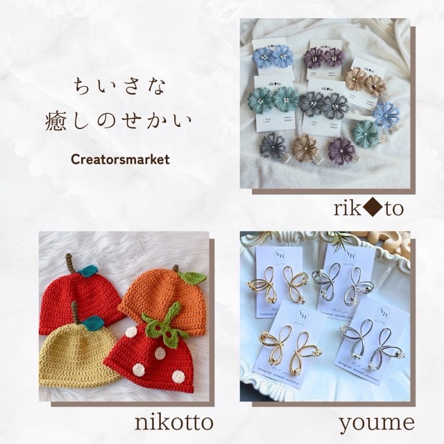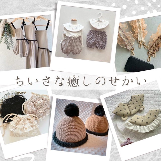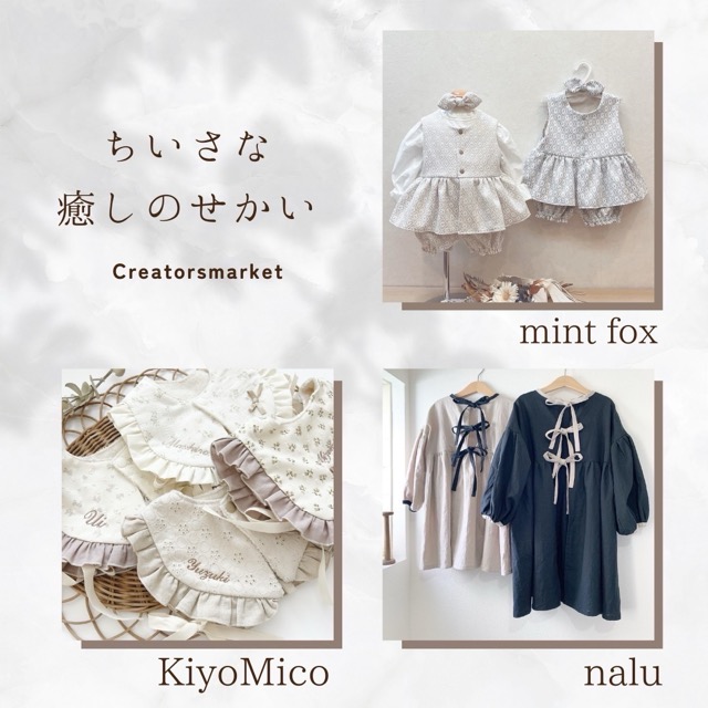 - 「ちいさな子供の物でママがちいさな癒しを得られる場所」6名の作家がお届けします!《KiyoMico》ポーチを中心とした布小物、刺繍小物《mint fox》トレンドと機能性を意識した子供服《youme》美容師が作るアクセサリーと小物《nalu》こだわりの綿・麻生地でナチュラルな服と小物《nikotto》かわいい手編み帽子《rik◆to》ママも嬉しい赤ちゃん小物