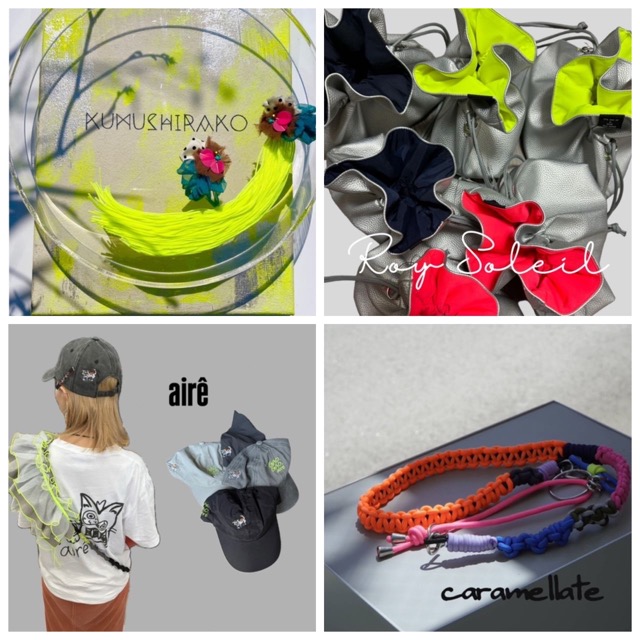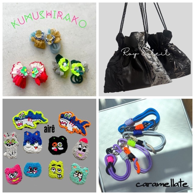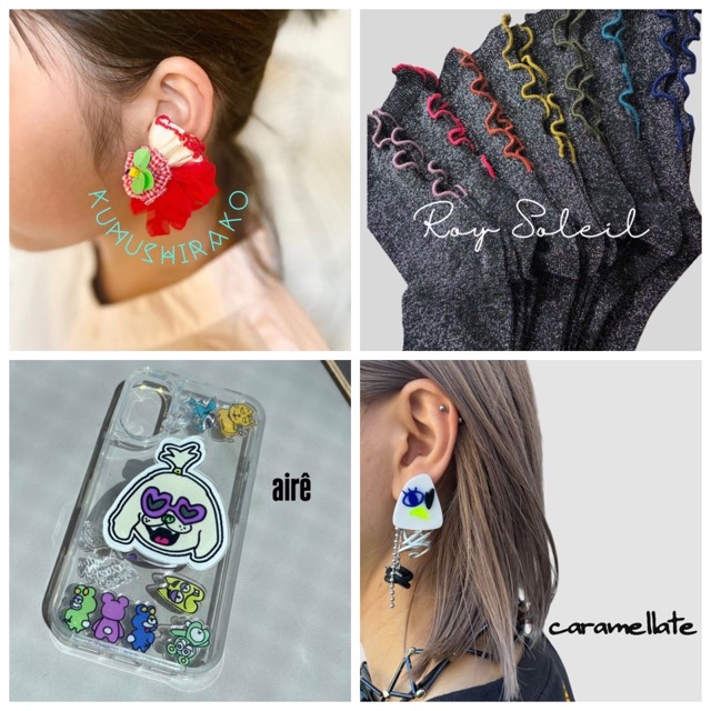 - roy_soleil→色や質感にこだわり、コーディネートのアクセントになるようなファッションアイテムを製作しています。 kumushirako._.accessory→大ぶりだけど、軽くてワンポイントになるアクセサリー air→オリジナルキャラグッズとフリルの販売。 caramellate→他にはないオリジナルアクセサリーや編み方や配色に拘ったショルダーを制作しています。