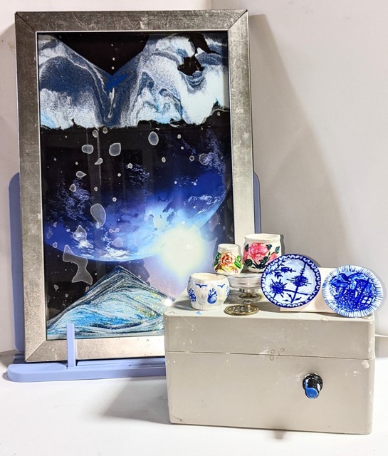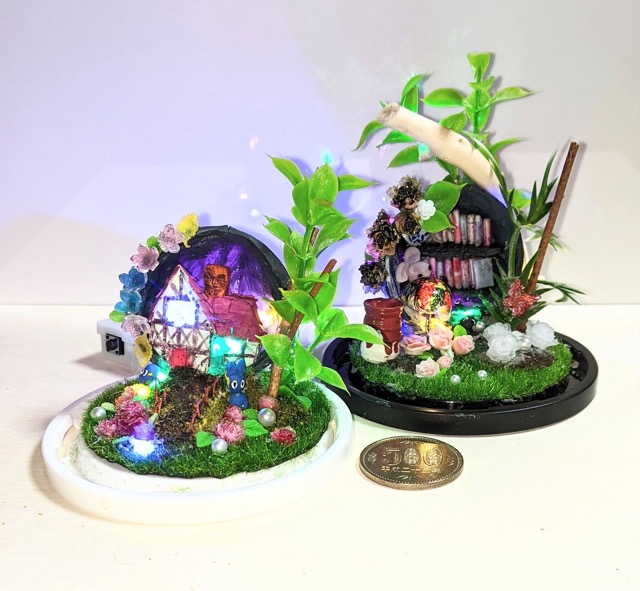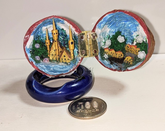 - ワークショップ サンドピクチャー プレートの中で水と空気と砂が動き回ることで様々な絵を描くアートフレーム 指ろくろ 電動ミニろくろを使って一輪ざしや皿などを作るミニ陶芸 その場で、絵付けし焼いてお持ち帰りいただけます 物販 胡桃の扉 胡桃の中のジオラマ 扉を開けて小さな小さな不思議の世界を覗いて見て下さい