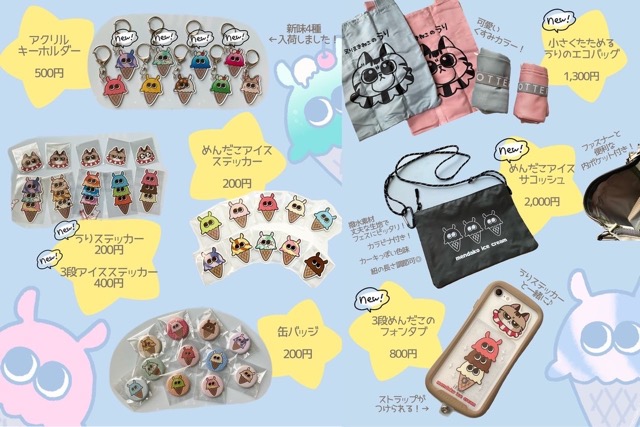 - 【めんだこアイス】いろいろな味のめんだこがコーンにのって、アイスクリームになっちゃった◎◎あなたの好きなめんだこアイスを見つけにきてね!!ゆるっとかわいいイラストを描いてます。今回は「めんだこアイス」「えりまきねこのうり」メインでステッカーやアクキー、缶バッジ等のグッズを用意しております。ぜひお立ち寄りください◯