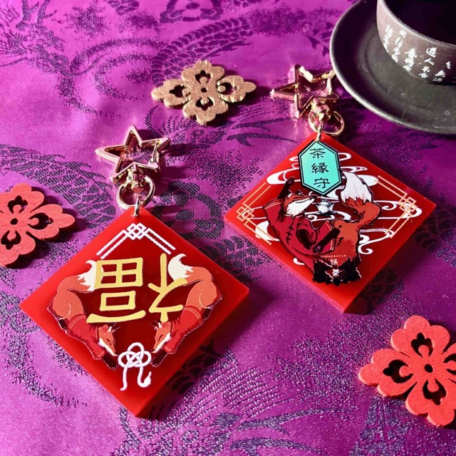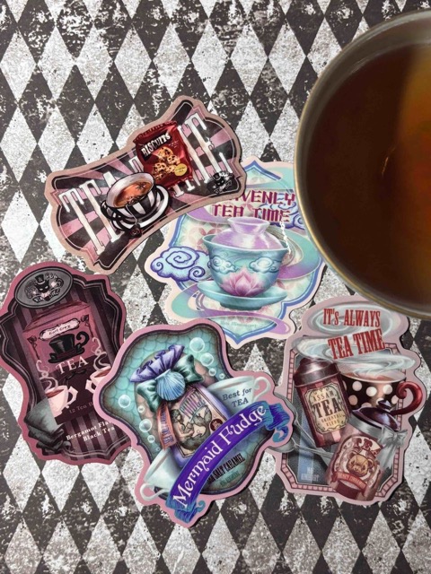 - 『ダークファンタジー』と『お茶』をテーマにイラストを描いてデザインしたステーショナリーやアクセサリー・雑貨などを作っています。黒猫店主の営むお茶屋と狐の営む中国茶屋を舞台にしたサブシリーズの画集や空想のお茶メニューイラスト雑貨なども。