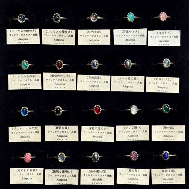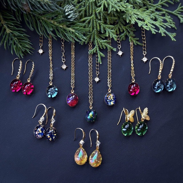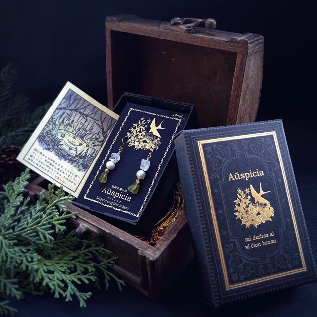 - 〈妖精の棲む森・アウスピシアで見つけた宝物〉昏い森を灯す道標のようなアクセサリー。耳飾りは絵物語付きで、本のような箱を開けると物語が始まります。珍しいヴィンテージガラスや天然石を集めてお仕立てしたファンタジックなアクセサリーです。