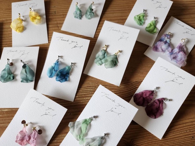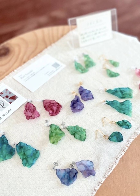 - 作家 Riel Suzukiの染めのイヤリング "The petals" は、染めた布を一枚一枚丁寧に仕立てた、色も形も世界にひとつだけのイヤリングです。花びらが耳元でそよぐように揺れ、軽やかでたおやかな印象を添えてくれます。また、日本の伝統技法「糊防染」で染め上げたアートパネルも展示いたします。色彩の美しさと金彩の煌めきが響き合い、日々にそっと寄り添う一枚となります。ぜひお立ち寄りください。