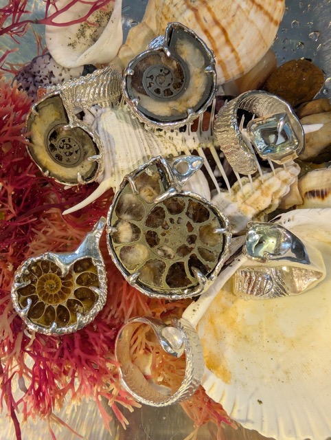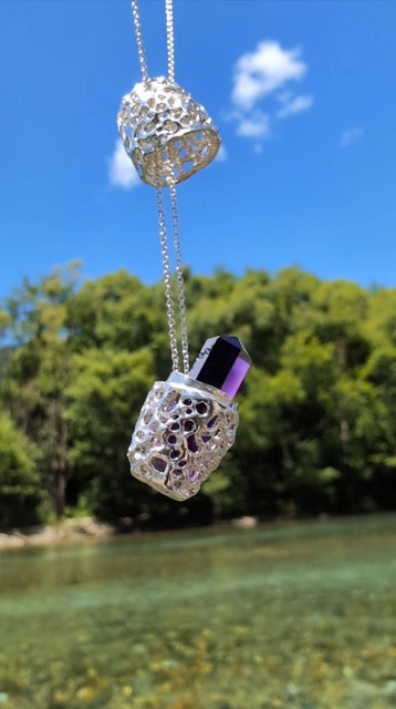 - 自宅工房で1人貴金属加工をするキッチンジュエラー。森で見つけた山繭(スカシダワラ)や庭で拾った葉脈(梅、キンモクセイ)にワックスを丹念に塗り、銀の網目を鋳造しました。銀の網目はオブジェ、ペンダント、リングへと発展、色石がよく映え銀と調和しています。波乗りアンモナイト、アンモライトのカラフル猫、トルマリンの小さなおうち、ペンダントにもちょっと楽しい世界が広がります。是非、いらしてください!