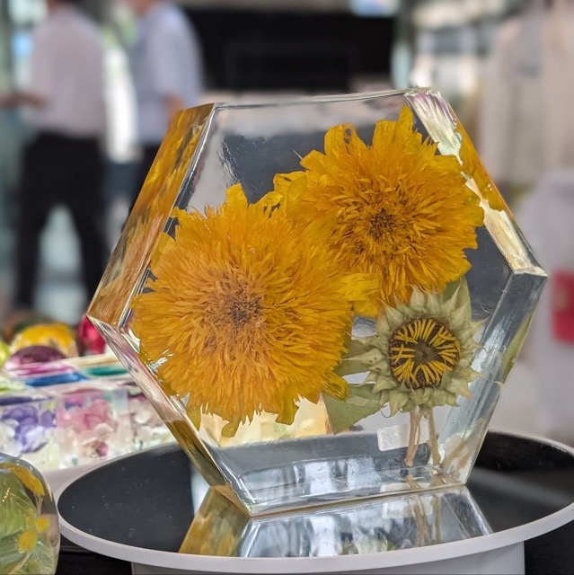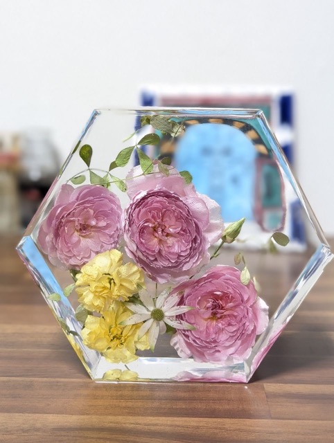 シリカゲルで丁寧にドライフラワーにした花をエポキシレジンの中に封入したインテリア小物。いつまでも枯れる事のない花を飾ってみませんか?