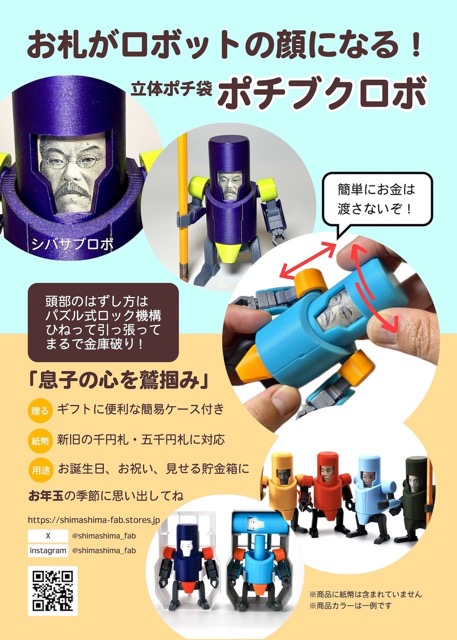 - お年玉袋を探している方はぜひ! 紙幣が顔出しで収納できる立体ポチ袋、ポチブクロボをご覧ください。。新旧両方の千円札・五千円札に対応しました。「簡単にお金は渡さないぞっ!」 筒状の頭部の取り外しにはシリンダー錠のようなパズル構造を採用。頭を右左に回したり抜き差しを決まった手順で行わないと、紙幣の入った頭部が外れないようになってます。そのためちょっとした金庫破り気分を味わえます。