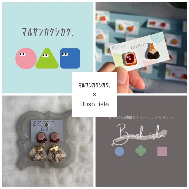 - 《マルサンカクシカク.》キョロキョロおめめがかわいいプラバンアクセサリーや雑貨をつくっています(^^) 《Bush isle》美濃焼タイル、ビーズ刺繍、インド刺繍リボンを用いて、さりげないけど個性的なアクセサリーを製作しています。