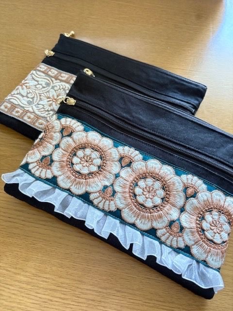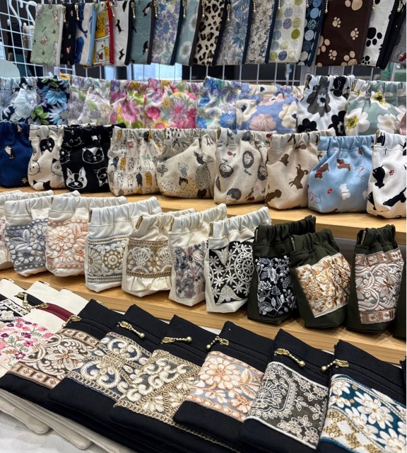 - インド刺繍やかわいい柄の生地を使って ポーチ、バネ口、ヘアバンドなどたくさんご用意してお待ちしております。