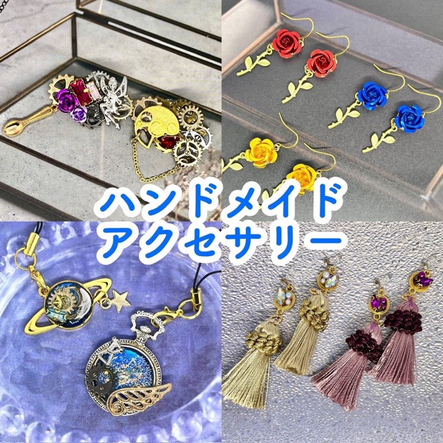 - レジンを中心にハンドメイドアクセサリーを制作しております。 ピアス・イヤリング、ストラップ、バッグチャーム、ブローチ、10cmぬいぐるみ用アクセサリーアイテムなど