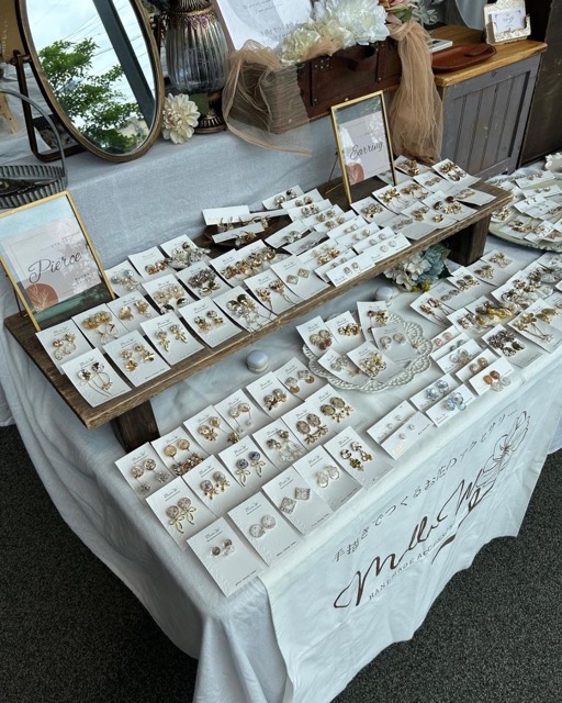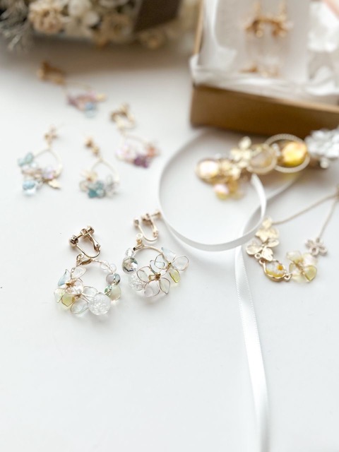 - 1年半ぶりの出展です。花びらひとつひとつ描きあげたボタニカルフラワーアートと、一本の細いワイヤーでつくるディップアートを組み合わせたオンリーワンの繊細で華やかなアクセサリー。普段使いからフォーマルまで、選びきれない!というご意見をいただく程に、沢山のデザインをご準備しています。ピアス・イヤリング・イヤーカフ・ヘアアクセサリー・ネックレスがメインです。