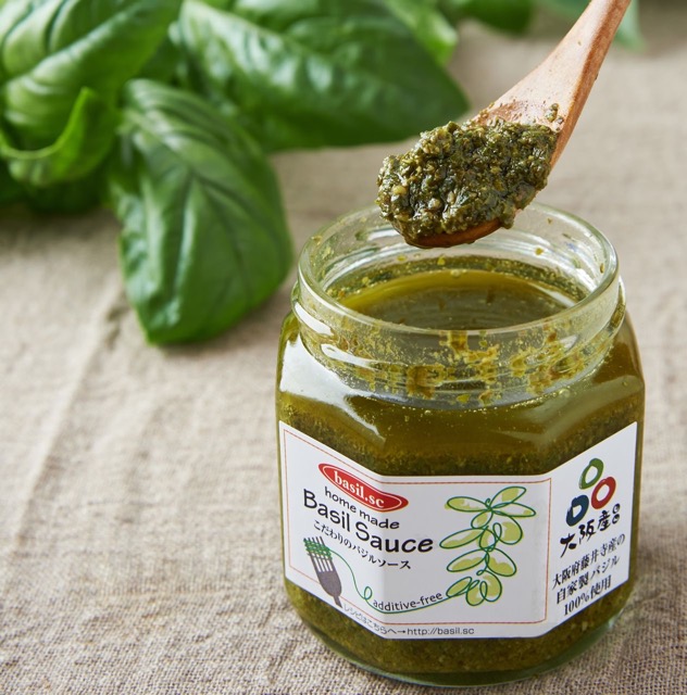 大阪藤井寺市でバジルとニンニクを栽培し、収穫して24時間以内に加工瓶詰をしているので香り高いバジルソースです