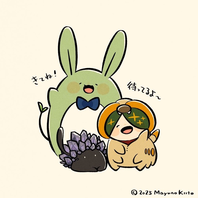 - 人間を辞めた先にある「繭ノ庭(まゆのにわ)」という世界。ここで暮らすほっこりかわいい生き物たちを描いています。今回はその中でもVtuber活動をしている「うさみんと」「ゆひこ」のグッズを中心に持っていきます。めちゃくちゃ久々のイベント参加です。よろしくお願いします!今年作ったばかりのXアカウントもぜひご覧ください。そして世界観が好みでしたらぜひお越しくださ〜い!