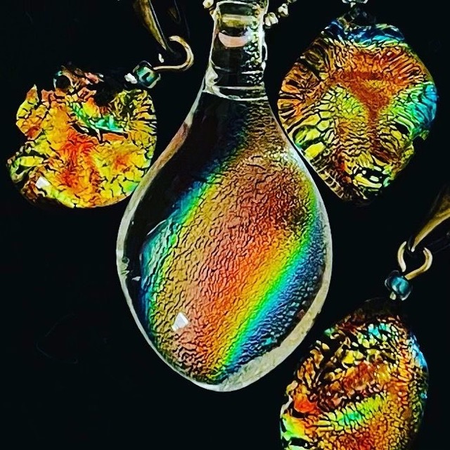 - ガラスのか中に金属を高温で焼き込んで行く独自の技法で発色させています。見る角度で変化してゆく色彩は時に想いも寄らぬ輝きが現れ、神秘的で作る度に感動的です。その感動を来場者の方々と共有し合える場こそがクラフトフェアには有ります。 写真では写らない美しさ、唯一無二の作品を是非、御手に取ってご鑑賞下さい。