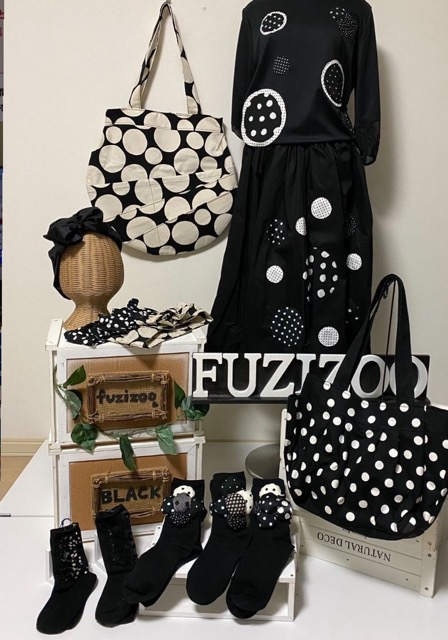 大好きなモノトーン、ドットにこだわって、1からつくるスカートやバックや小物と、市販の靴下やトップスに丸やフリルをつけたリメイクアイテムを作っています